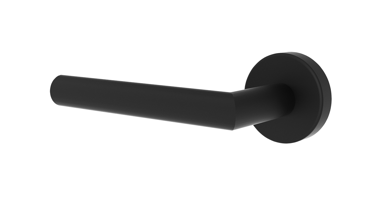Die schlichte L-Form des Griffs mündet in einer runden festdrehbaren gelagerten Rosette und sorgt für ein elegantes, zurückhaltendes Erscheinungsbild. Die matt schwarze Oberfläche harmoniert zusätzlich mit schwarzen Einrichtungselementen.