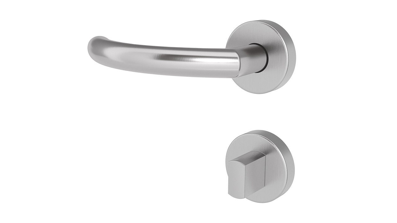 Die Drückergarnitur ist mit runden Klipprosetten ausgestattet. Die matt gebürstete Edelstahl-Oberfläche vermittelt ein angenehmes Griffgefühl, ist ausgesprochen widerstandsfähig und verhindert effektiv sichtbare Fingerabdrücke – für eine dauerhaft gepflegte Optik.