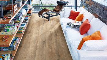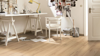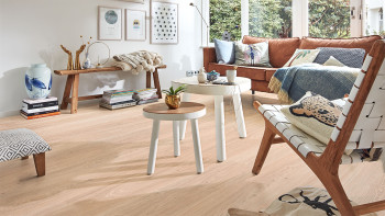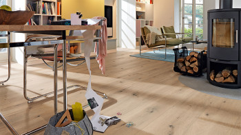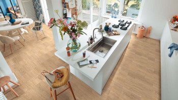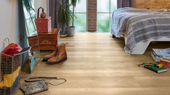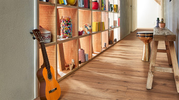 The integrated underlay noticeably dampens walking noise depending on the subfloor, reduces impact sound in adjacent rooms, and significantly improves your living comfort.