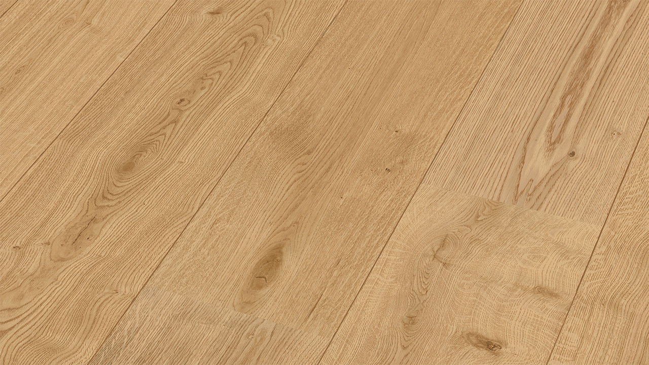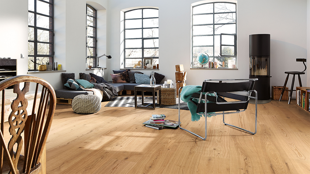 Der Lindura-Holzboden HD 400 verbindet die natürliche Schönheit von Echtholz mit einem besonders widerstandsfähigen Produktaufbau. Die großzügige Schlossdiele bringt Holzflächen vor allem in offenen und repräsentativen Räumen eindrucksvoll zur Geltung.