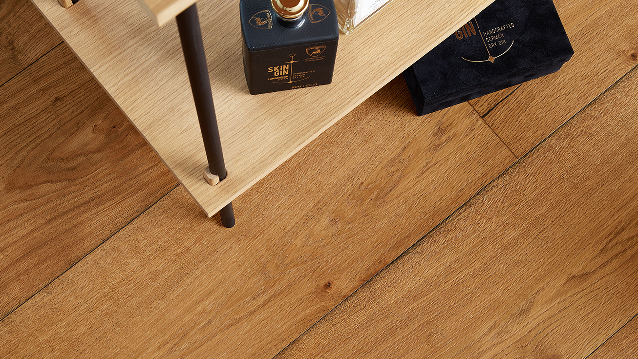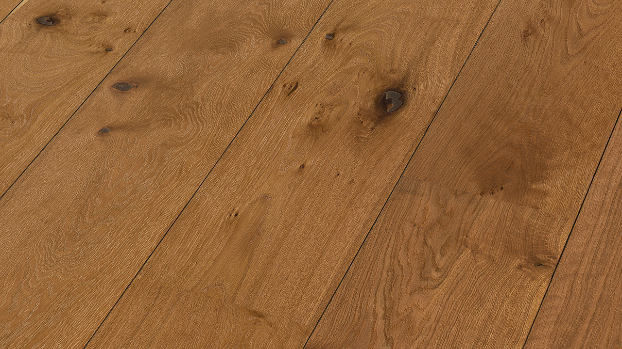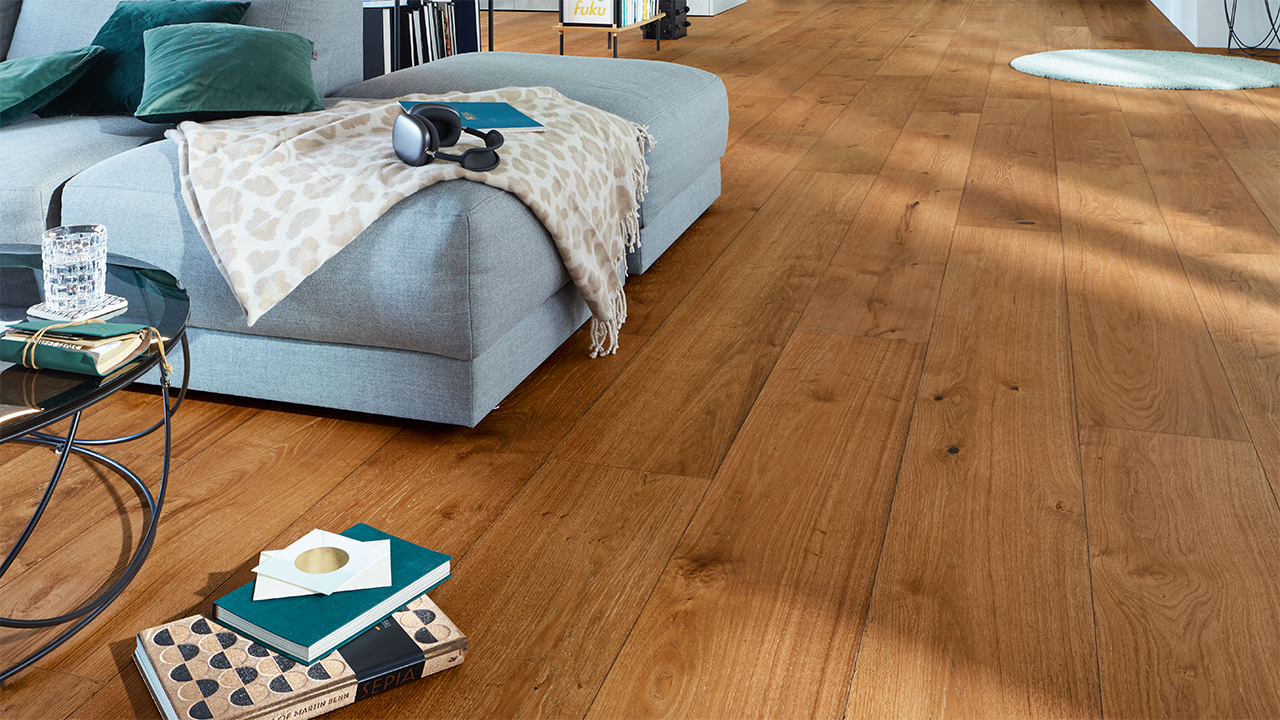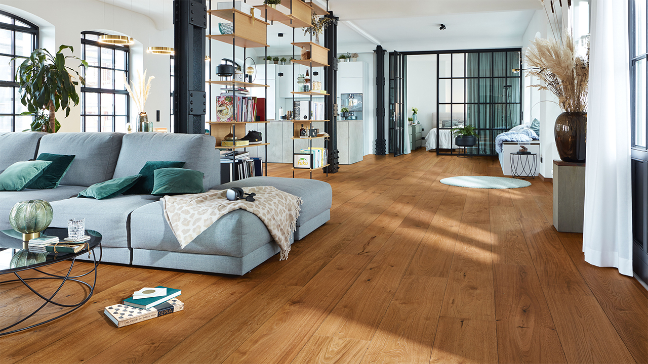 Der Lindura-Holzboden HD 400 verbindet die natürliche Schönheit von Echtholz mit einem besonders widerstandsfähigen Produktaufbau. Die großzügige Schlossdiele bringt Holzflächen vor allem in offenen und repräsentativen Räumen eindrucksvoll zur Geltung.