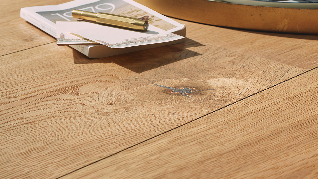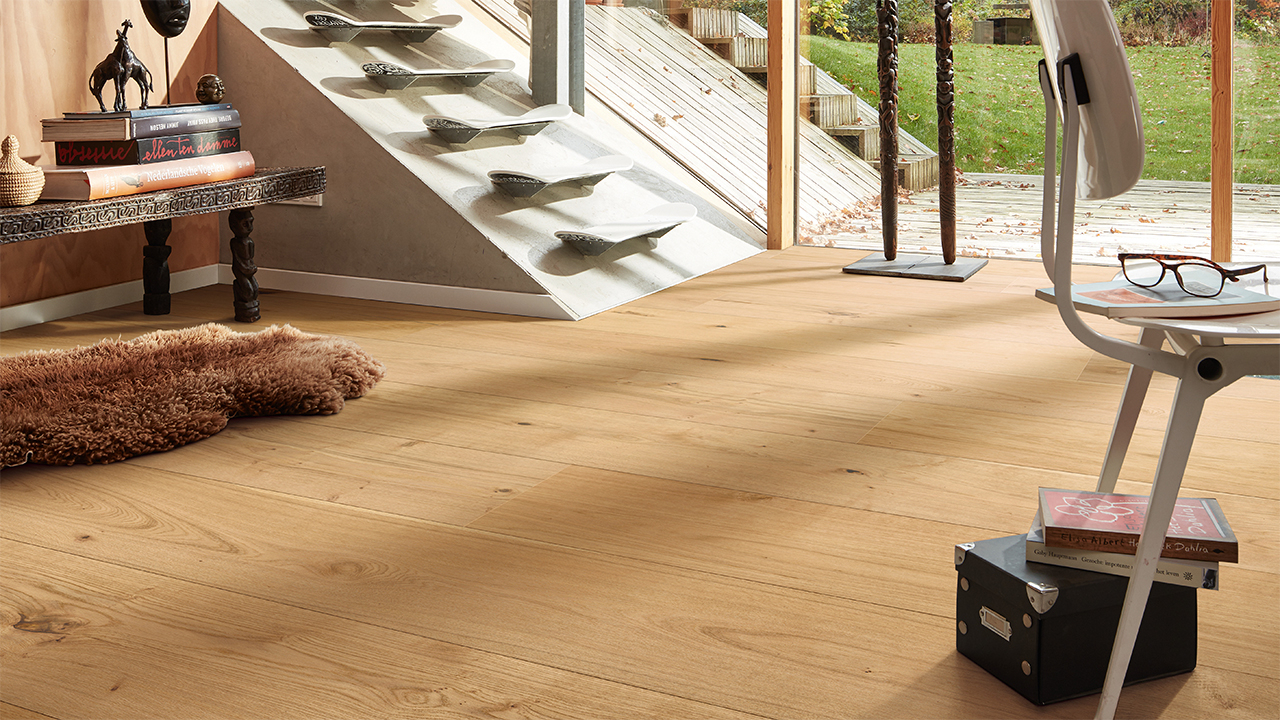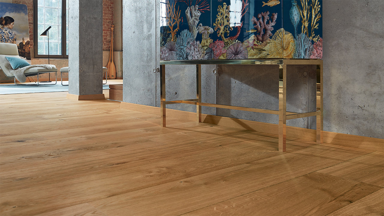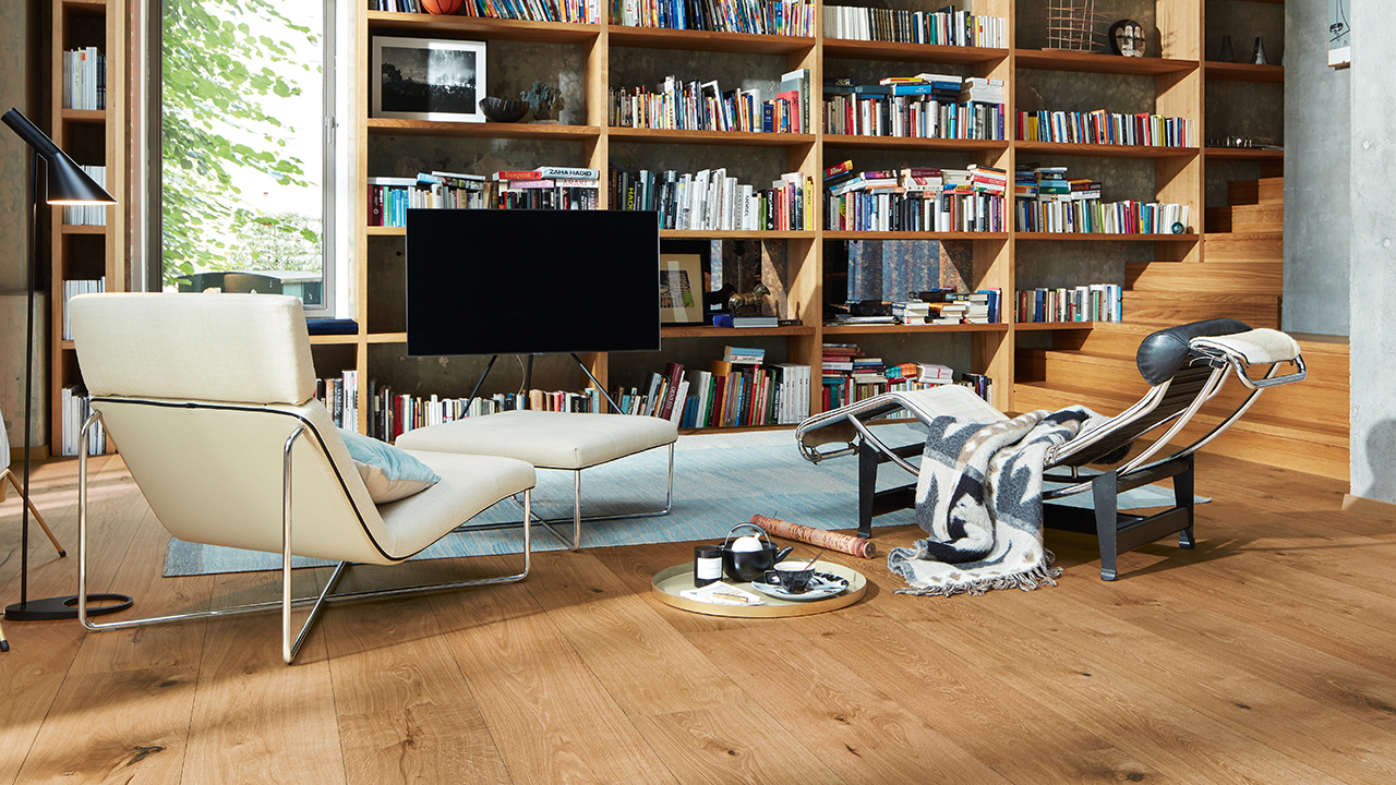 Der Lindura-Holzboden HD 400 verbindet die natürliche Schönheit von Echtholz mit einem besonders widerstandsfähigen Produktaufbau. Die großzügige Schlossdiele bringt Holzflächen vor allem in offenen und repräsentativen Räumen eindrucksvoll zur Geltung.