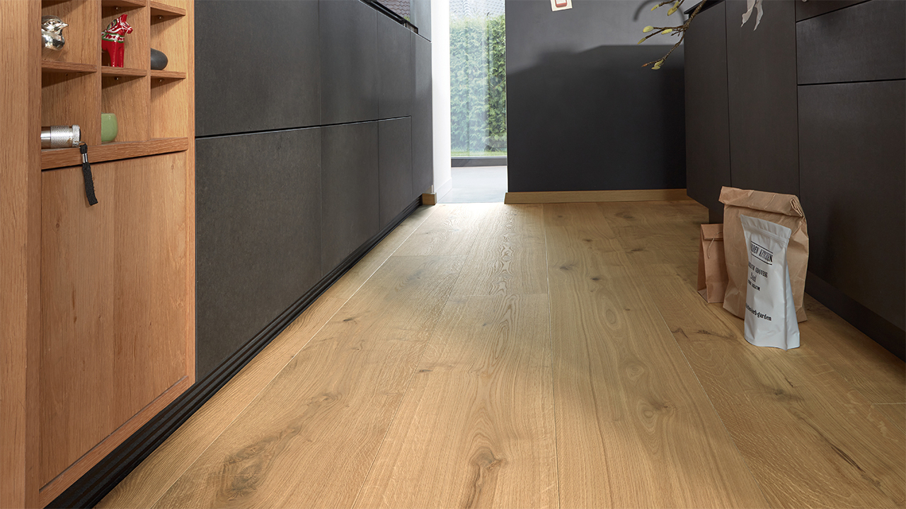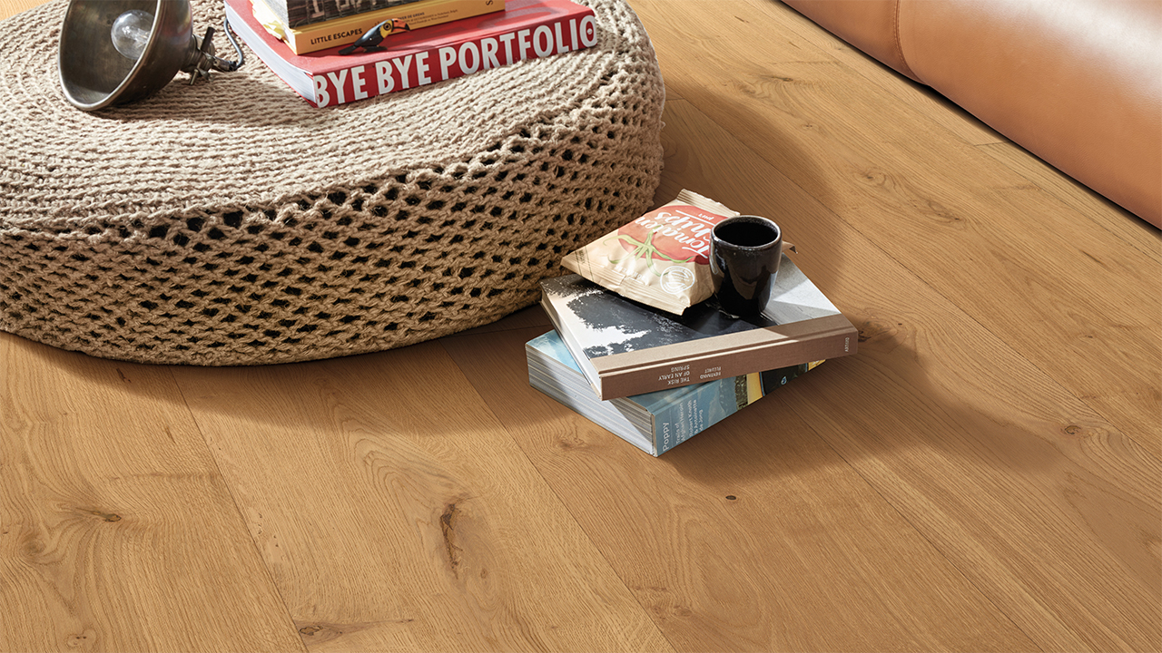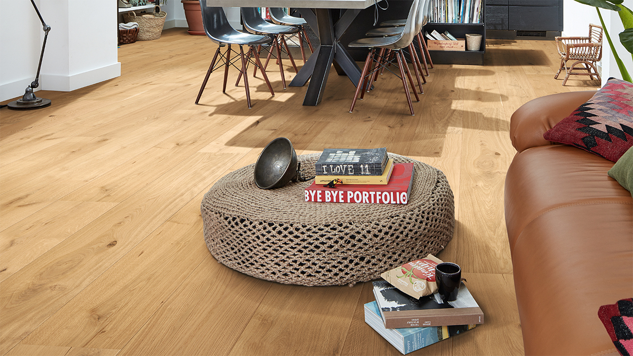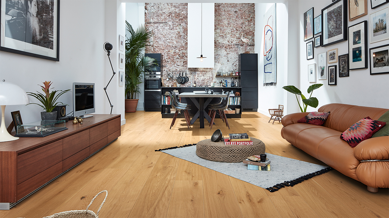 Der Lindura-Holzboden HD 400 verbindet die natürliche Schönheit von Echtholz mit einem besonders widerstandsfähigen Produktaufbau. Die großzügige Schlossdiele bringt Holzflächen vor allem in offenen und repräsentativen Räumen eindrucksvoll zur Geltung.