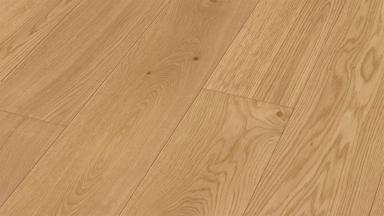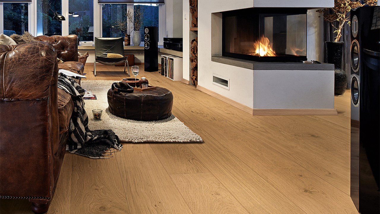 Der Lindura-Holzboden HD 400 verbindet die natürliche Schönheit von Echtholz mit einem besonders widerstandsfähigen Produktaufbau. Die großzügige Schlossdiele bringt Holzflächen vor allem in offenen und repräsentativen Räumen eindrucksvoll zur Geltung.