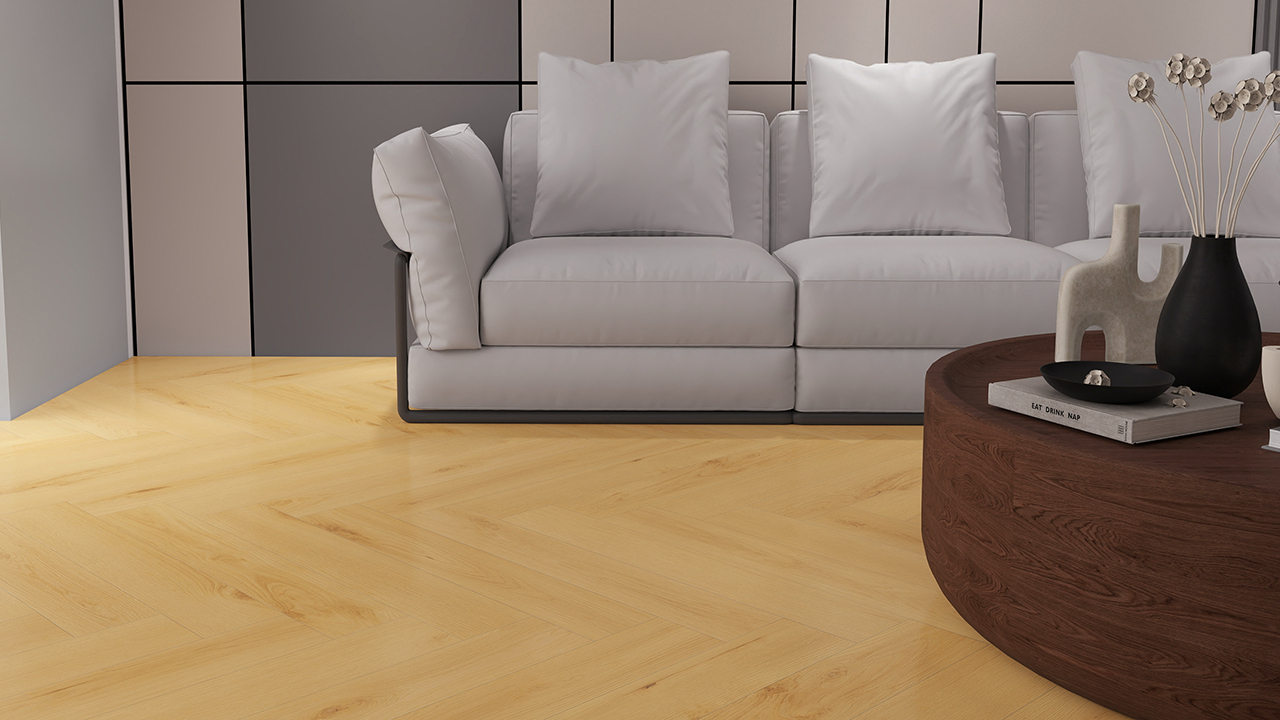 Our Signature HB collection from planeo offers all the advantages of a rigid vinyl floor and is already equipped with 1.5 mm thick IXPE impact sound insulation. It impresses with its realistic wood look in the Signature HB Sorell herringbone design, an authentic synchronised embossing and a matt surface that gives your home an elegant and high-quality atmosphere.