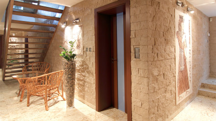 Modern wall design in natural stone look with planeo stone facing. With planeo stone facing bricks made of natural mineral base materials, you can give your house or flat a modern look with little effort. In this way, architectural highlights can be emphasised with simple means: The fireplace, the kitchenette, the bathroom or even the staircase can be highlighted with planeo stone facing. Or set special home accents by structuring walls or emphasising pillars, for example.